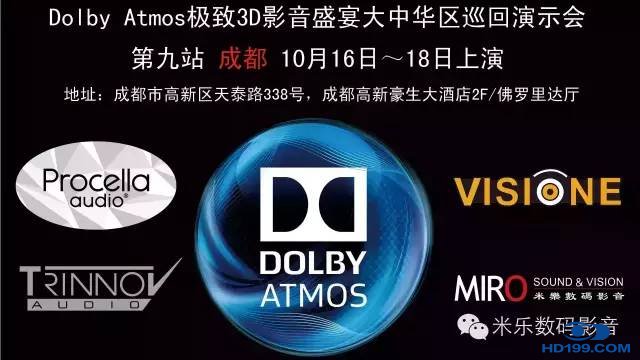 由杜比实验室与米乐数码影音联合举办的杜比全景声(Dolby Atmos)极致3D影音盛宴大中华区巡回演示会第九站成都站,将于2015年10月16日~18日(2015成都国际音响节)期间在成都高新豪生大酒店2楼佛罗里达展厅举行。