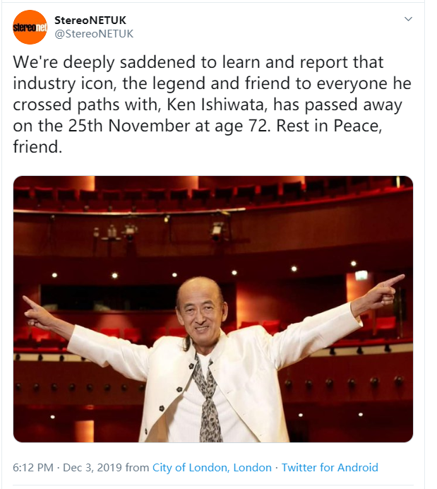 各位影音爱好者,我们无比沉痛的通报大家一个悲伤的消息:影音界传奇人物,前马兰士品牌大使,Ken Ishiwata石渡健先生,于11月末去世,终年72岁。走得很安详平静。