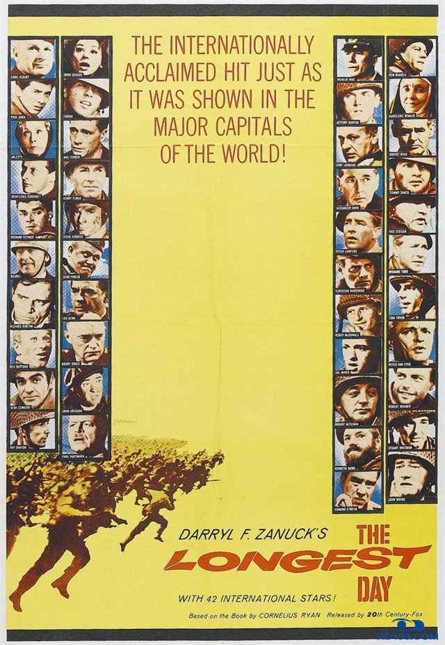 《最长的一天》 与《虎虎虎》类似,该片分别从盟军和德军双方面的角度同时描述诺曼第登陆这一“迄今为止人类历史上规模最大的一次海上登陆作战”。此次战役, 盟军一共集结了288万人的部队。先后调集了陆军36个师,包括23个步兵师,10个装甲师,3个空降师,相当于20世纪末美国的全部军队。诺曼底登陆的成功,开辟了欧洲第二战场,加速了二战的结束。影片的震撼之处在于场景的真实,导演不厌其烦地对开战前后各方面事件进行全景式的描写,就像片名所说,观众也会如临其境——这是最长的一天。