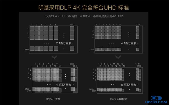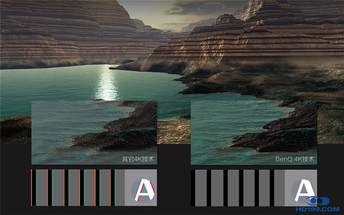 不同于市场上以全高清线下元件作分时位移显示处理的概念型4K投影机,明基W11000色准家用投影机可完整显示830万有效像素,符合美国消费电子协会CEA推出的4K UHD超高清标准。W11000采用美国德州仪器DLP高阶显示芯片,这种芯片每秒钟转动9000次,在画面上投出独立且清晰的像素点。有效避免3LCD投影机因合光流程而造成的伪影问题,画面边缘不会出现异常颜色,保证清晰视觉。