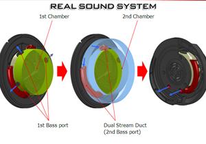 此外,产品还采用了Stream woofer DB(导管式超重低音结构)技术和上述的凯尔顿低音炮技术共同组成了双重低音反射系统。右上角图示中红色的导管及蓝色的箭头指向部分就是声音在通过管道的过程中经过双重过滤而使低音变得纯净。这项技术同样也是首次运用在耳机生产上。