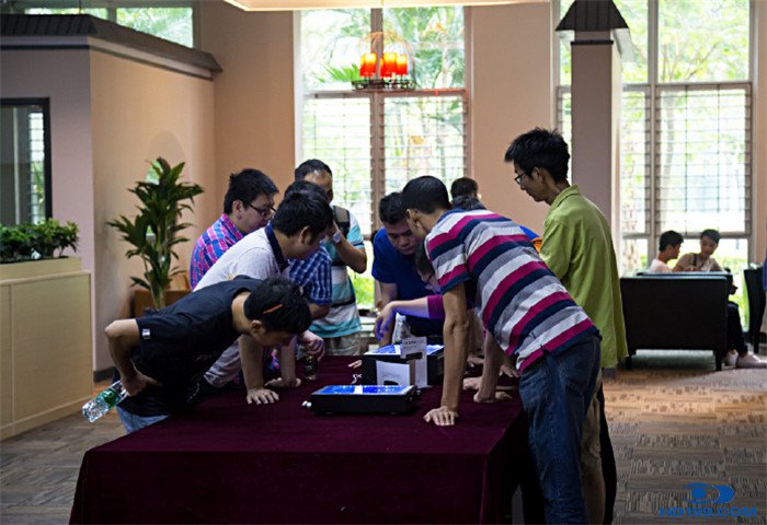OPPO UDP-205深圳鉴赏会合影留念。由于鉴赏会期间讨论热烈,活动结束时间比预计晚近一个半小时,即便如此,仍有多数烧友停留现场,向赖总编及余总沟通交流音视频调校及设备的相关问题。