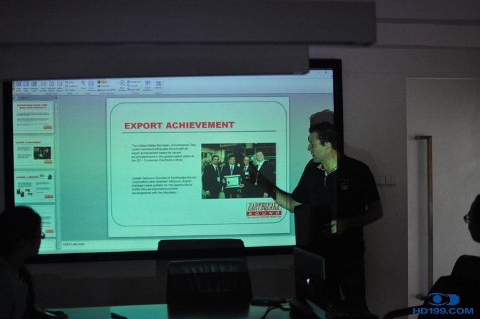 2015年10月29日,美国Earthquake Sound大地震创始人兼总经理Joseph Sahyoun先生再度亲临爱威影音,为全体销售技术团队做培训指导。爱威影音总经理王育恒先生、技术总监吕龙先生亲自负责接待工作。