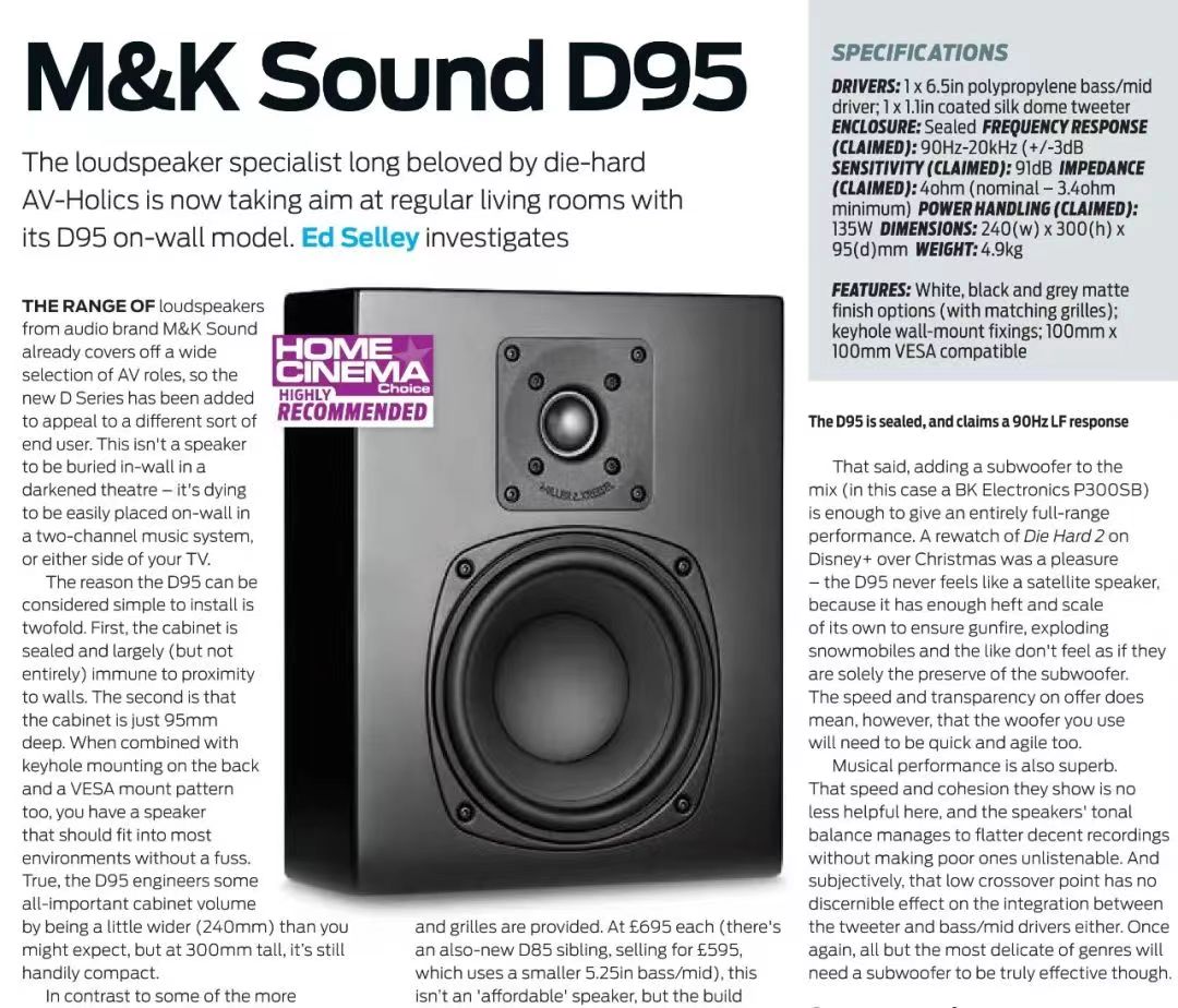 深受影音爱好者喜爱的家庭影院音箱品牌Miller&Kreisel推出了D95,它面向客厅市场,是真正适合居家陈列的音乐/电视用音箱。《Home Cinema Choice》的Ed Selley近日对它进行测评,并给予了“强烈推荐(Highly Recommended)”。