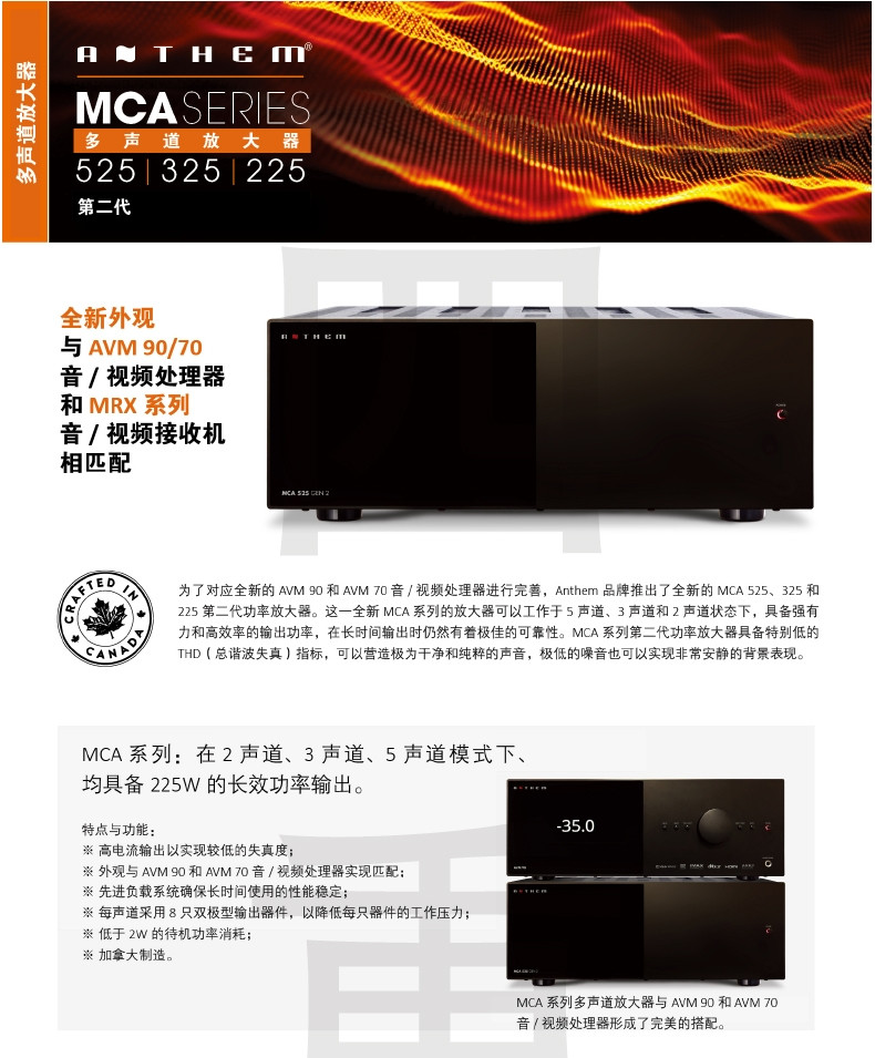 继全新的高阶环绕解码前级 AVM 70 与 AVM 90 上市后,Anthem 推出 MCA 525、325 及 225 Gen 2 多声道后级扩大机,以让AVM 70 / 90 的性能获得完整释放。