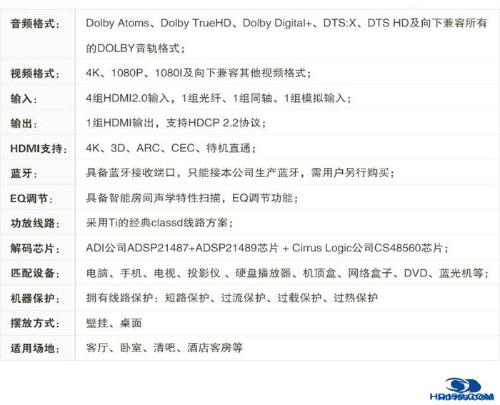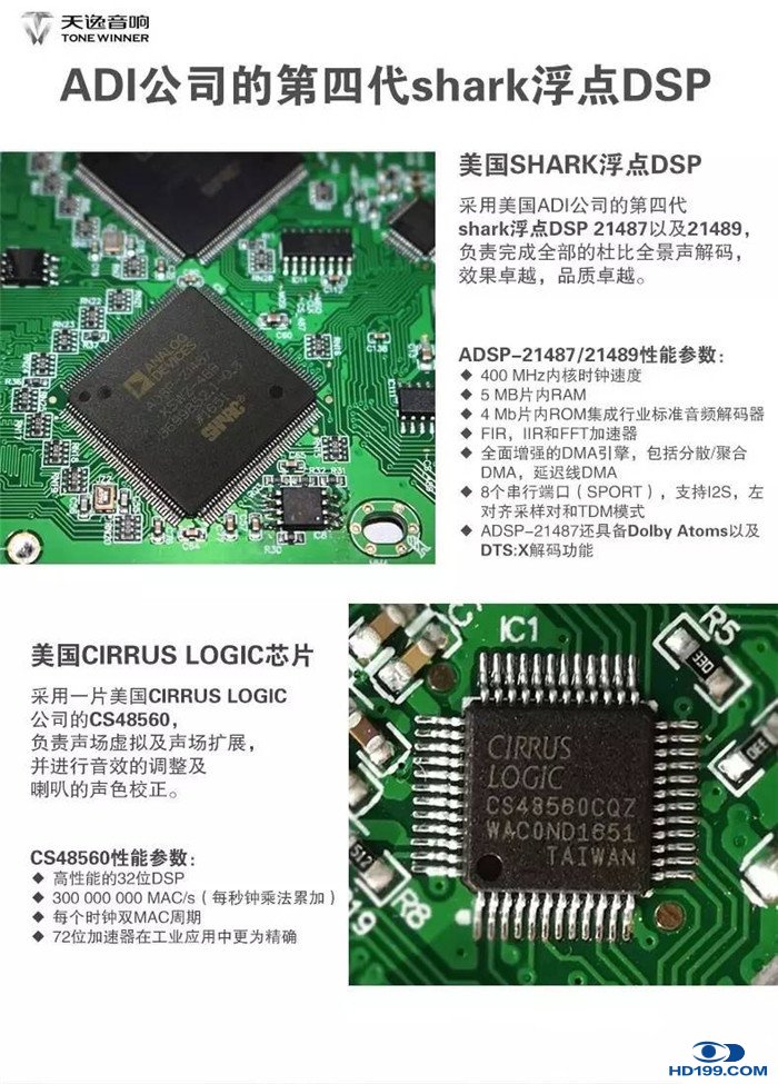 AT-01A采用三片DSP方案,其两片为美国ADI公司的shark浮点DSP,21487以及21489,另外一片DSP为美国Cirrus Logic公司的CS48560,这三片DSP的处理能力十分强大,前两片ADI芯片负责完成全部的杜比全景声解码,第3片CS48560 DSP负责进行声场后处理,包括声场虚拟及声场扩展,并且还要进行音效的调整及喇叭的声色校正。三片DSP完成杜比全景声的解码及音效后处理,效果卓越一流。功率放大部分采取美国TI公司最新最先进的数字放大器(D类放大器),提供25W×7 (RMS)的输出功率。超低音部分提供100W的强劲功率。完美的解码及声场处理加上强大的驱动功率,能重现出卓越的全景式环绕音效,让你在家也能有身临其境的影院享受。