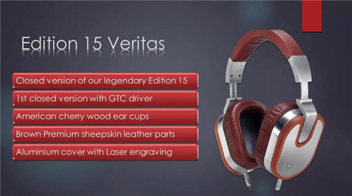 Edition 15 Veritas是第一副GTC镀金钛振膜的封闭式耳机。GTC镀金钛单元是极致开发的高级单元,兼具镀金单元的温暖醇和与镀钛单元的高素质,而且相比过去的极致耳机煲机时间更短、更快进入最佳状态。与Edition 15同样的皮箱、同样的LEMO耳机线插座,比Edition 15更高的灵敏度达到96dB。Edition 15 Veritas的腔体使用了木质细腻、有“木中瑰宝”之称的美洲樱桃木,皮肤所及之处皆采用棕色的美利奴绵羊皮,松软舒适。