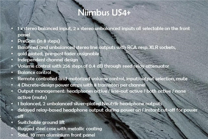 US4+即是NIIMBUS的终极魔法产物。1个4芯平衡耳机口、2个单端耳机口。8档增益选择,256级、每级0.4dB,4路放大平衡放大,独立声道设计,每声道8颗晶体管。毫不妥协的追求。