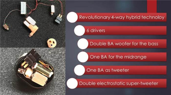 Saphire搭载了革命性的4路分频6单元混动技术,2个动铁单元负责低频、1个动铁单元负责中频、1个动铁单元负责高频,以及2个静电单元负责极高频。动铁单元的超高分析力举世公认。6微克的镀金静电振膜更轻、瞬态响应更快更准确,带来无与伦比的清晰细节。传统的静电耳机/耳塞需要专用的静电放大器,Saphire革命性地在内部集成变压器,由16μm的线绕15000圈,将信号放大100倍。25欧姆的阻抗完全不需要担忧无力驱动。航空铝腔体,镀铬面板,重量仅15克。Saphire有6种耳塞头可选择,线材可拆卸,标配2根耳机线,1根单端耳机线,1根2.5mm平衡耳机线。