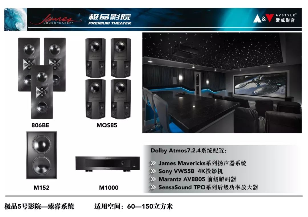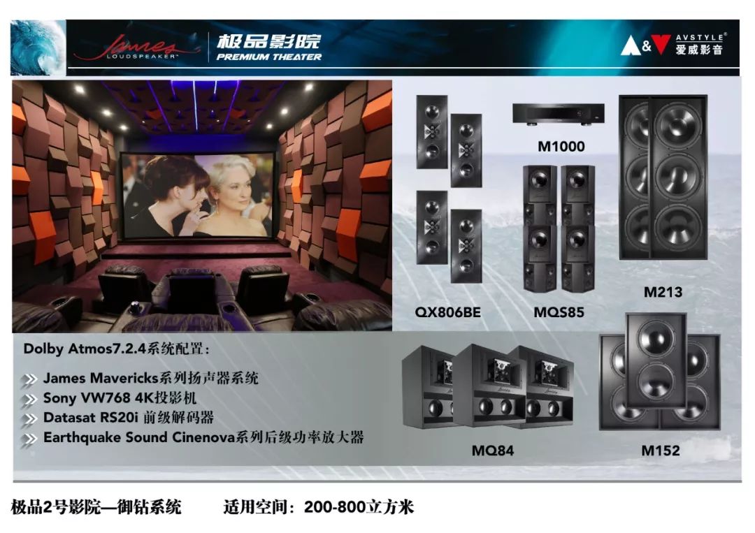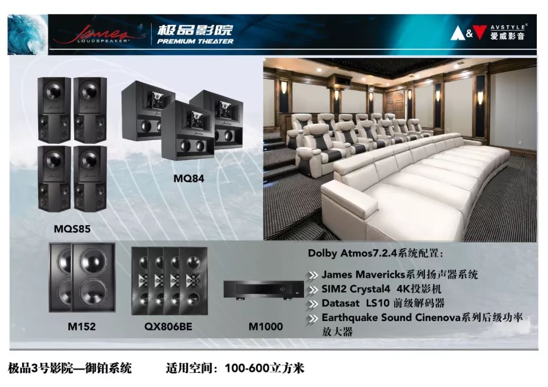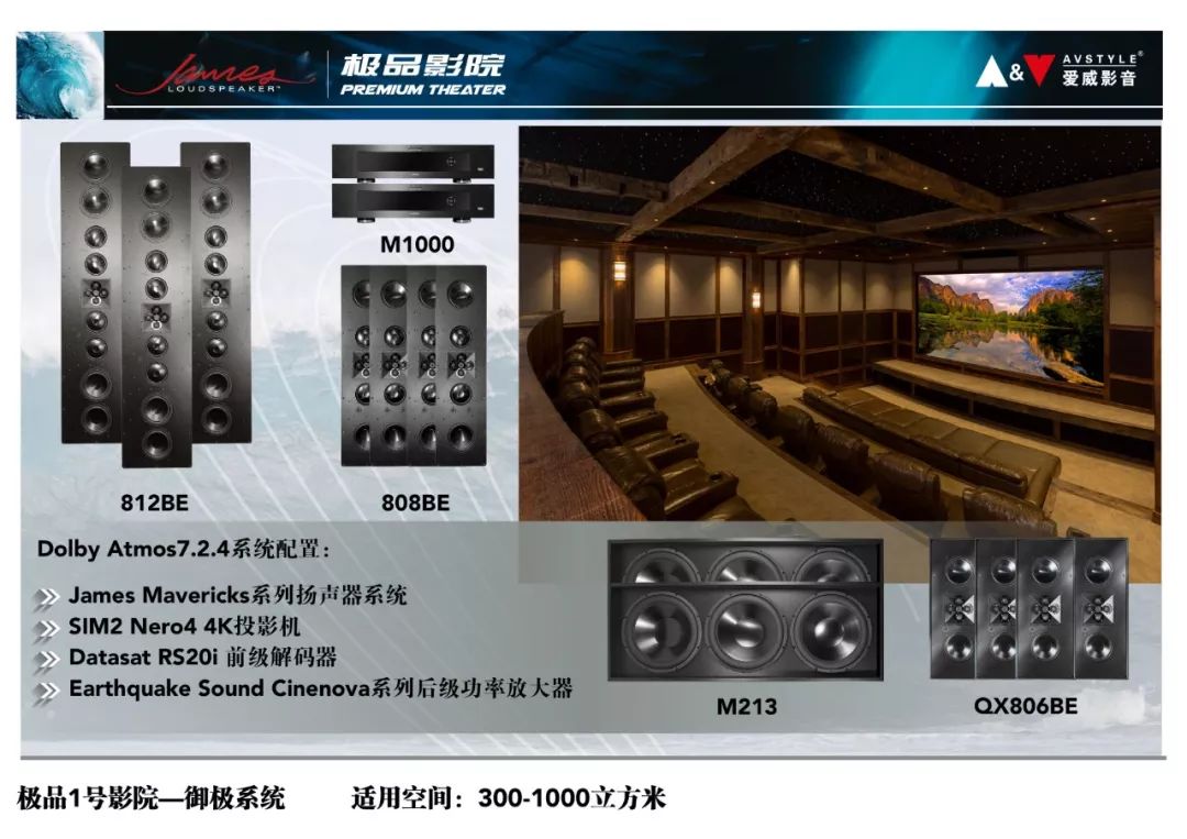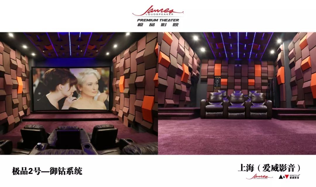 James极品影院是为了树立中国影音行业顶级私人影院的标杆,满足渴望享受极致私家影音体验的高端消费者视听需求,由爱威影音联合民用影院领域面向高端消费者的厂商(包括并不仅限于美国James Loudspeaker、意大利Sim2、日本Sony、美国Datasat、美国Vutec、美国Earthquake Sound、美国SensaSound等)联合打造的顶级私人定制影院品牌,James极品影院是由国内外资深专家团队联合操刀,针对私人影院空间涉及到的各个领域提供了最成熟、极稳定的综合解决方案,其开放性的平台设计可以随着影音技术的不断发展,不断升级,从而顺应科技发展的潮流。