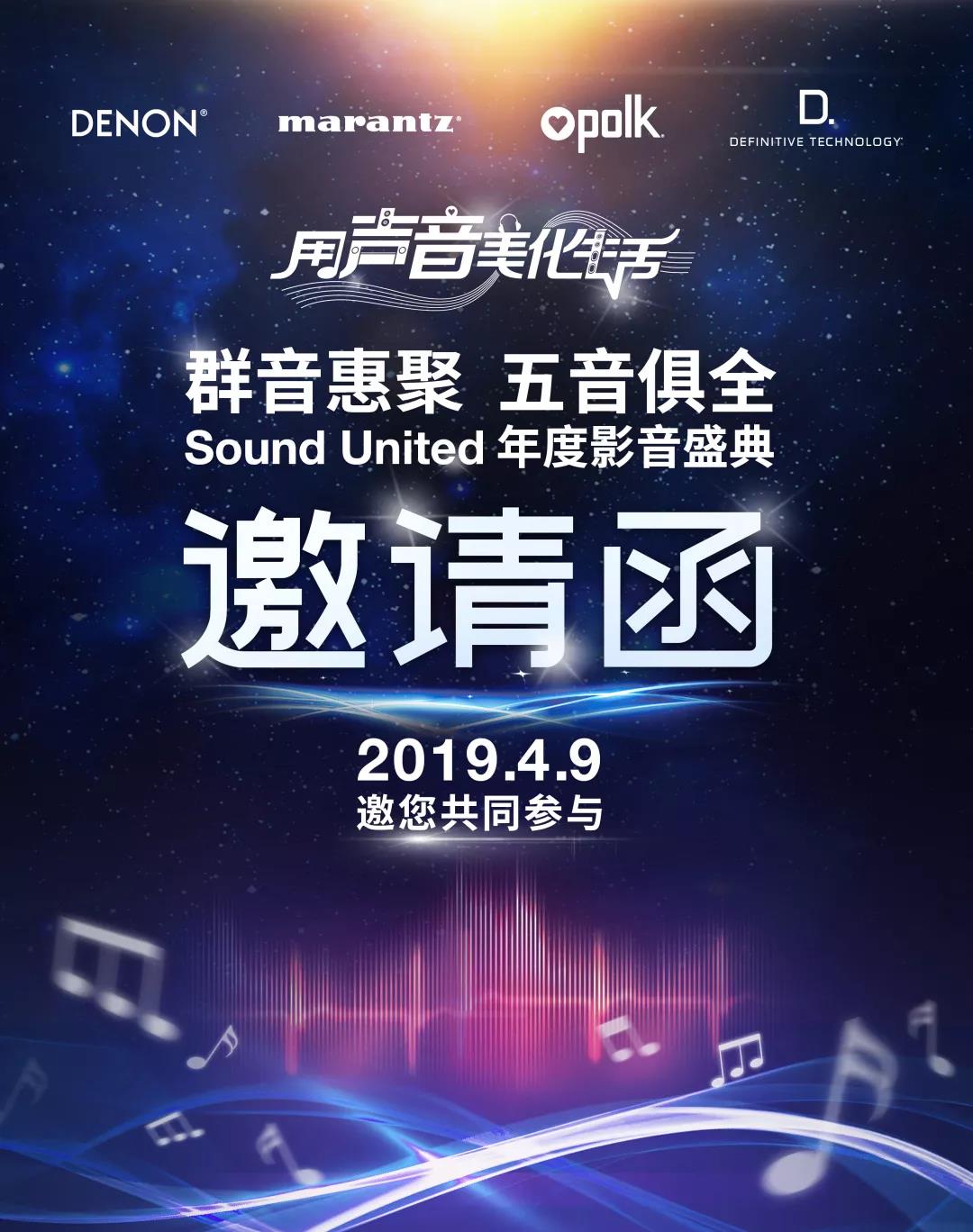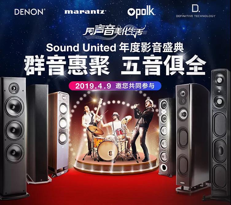 2019年4月9日,Sound United将迎来第一届“群音惠聚,五音俱全”年度影音盛典,现诚邀旗下四大影音品牌Denon天龙、Marantz马兰士、Polk Audio普乐之声、Definitive Technology狄分尼提,与粉丝朋友