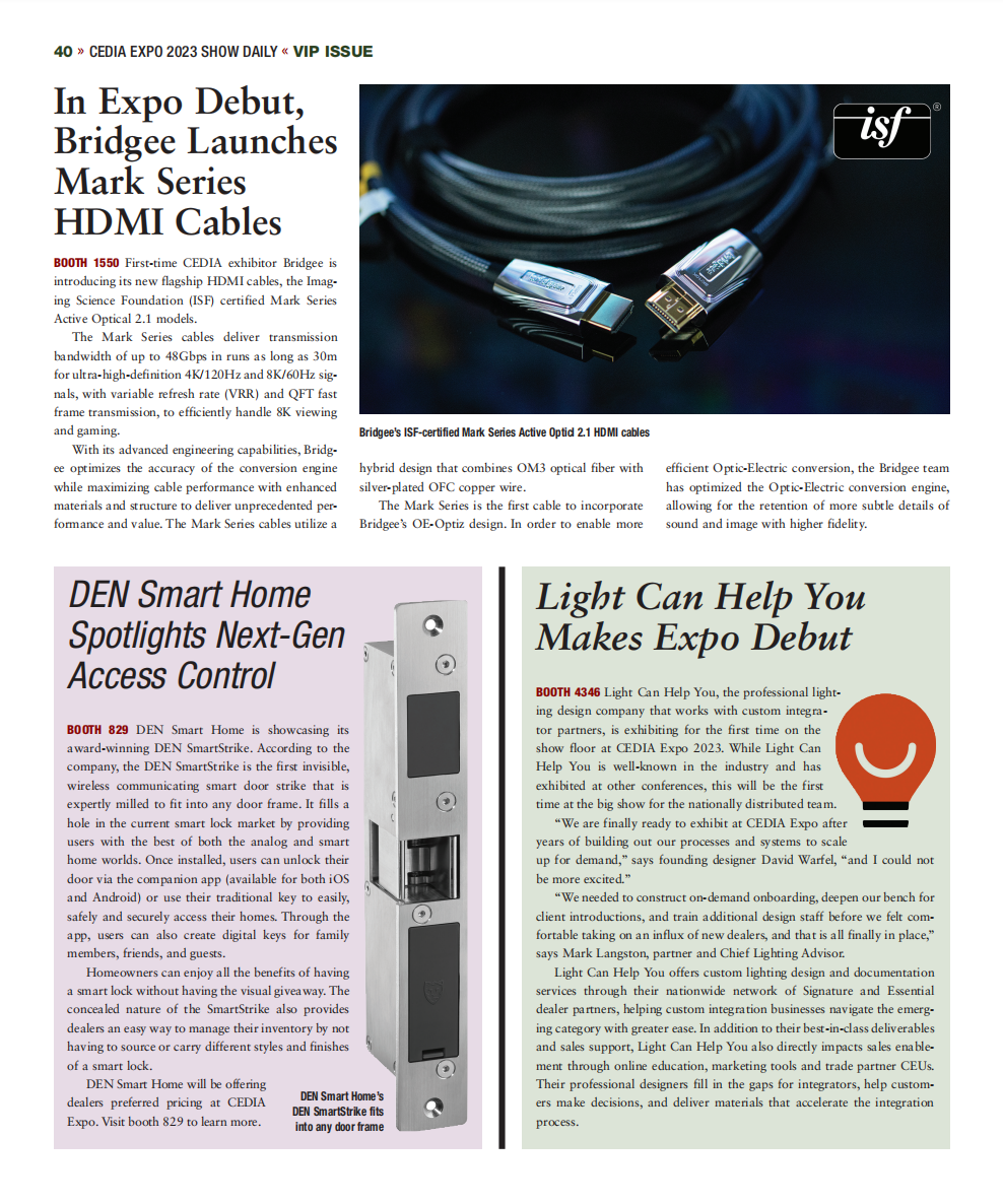 2023年,全球顶尖智能家居/影音展会CEDIA EXPO官方日报展示了桥界线缆(Bridgee Cable)的旗舰MARK2.1光纤线缆,其显眼的“ISF”认证白标更是彰显专业。