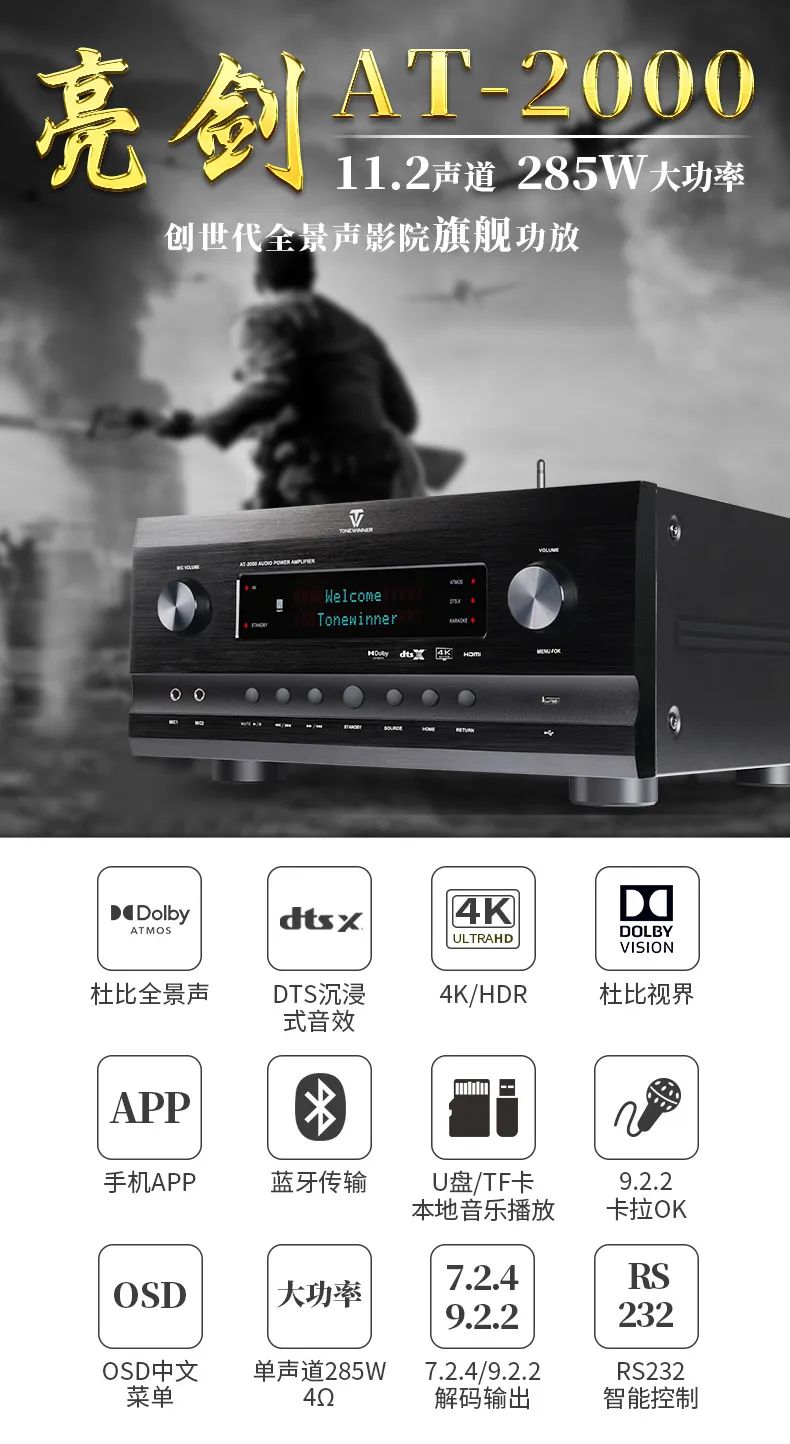 天逸AT-2000是一款11.2声道的全景声影K功放,采用7.2.4解码,获得并通过Dolby Atmos(杜比全景声)、DTS:X(沉浸式音效)、HDMI 2.1技术认证,支持4K超清视频格式,轻松获得专业级的家庭娱乐视听体验。