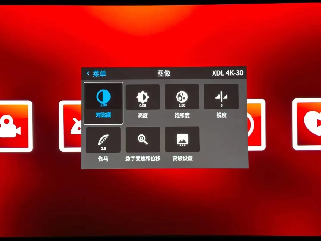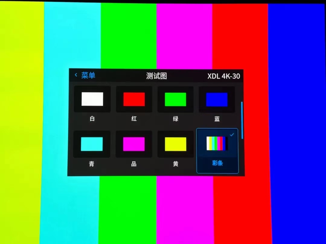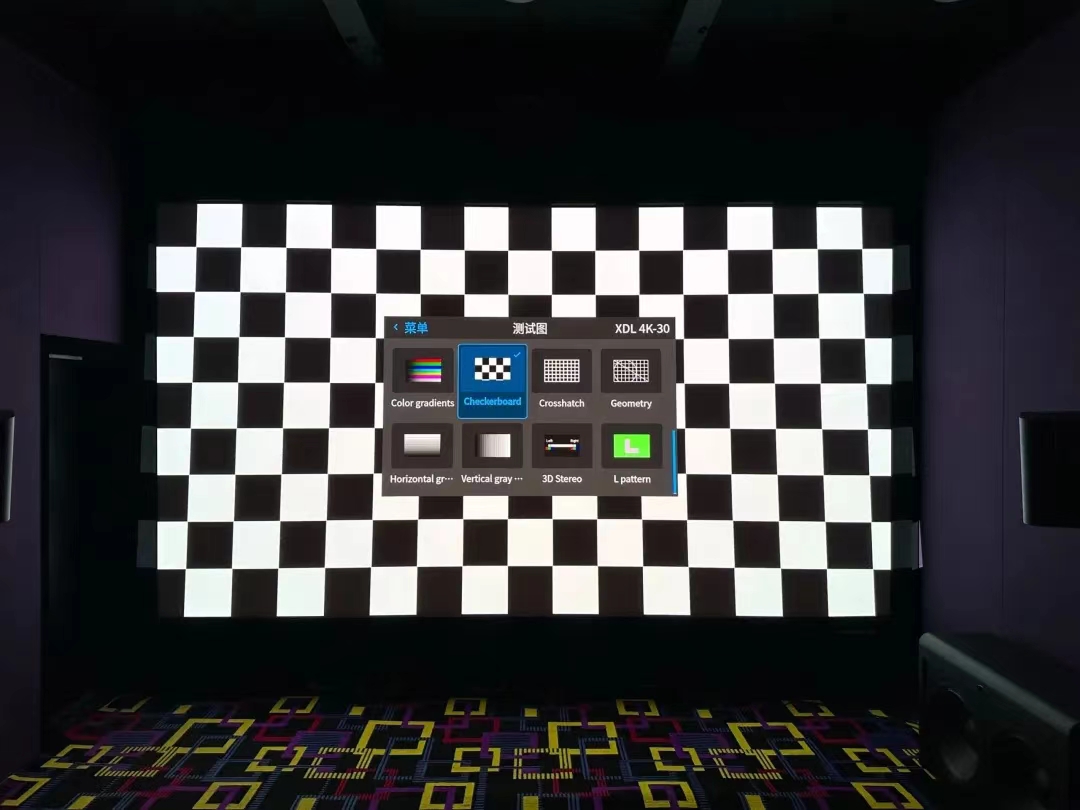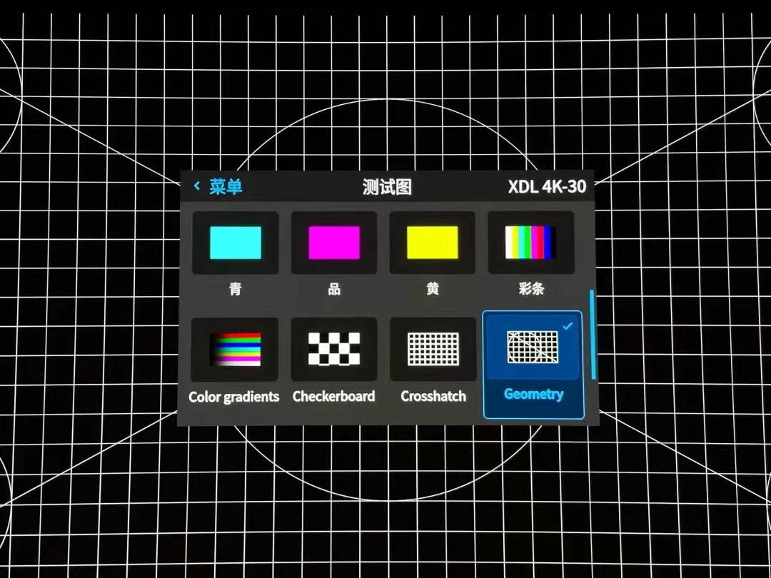 在投影机安装之后,我们就需要进行镜头设定和调色工作,4K30提供了相当多的校准工具和测试画面,例如Crosshatch和Geometry来修正画面的覆盖,另外还有Focus Green来校正锐度,另外还有6种原色的纯色图像信号,我们可以利用专业的图像测试仪器,来对颜色信号进行拾取和调整。