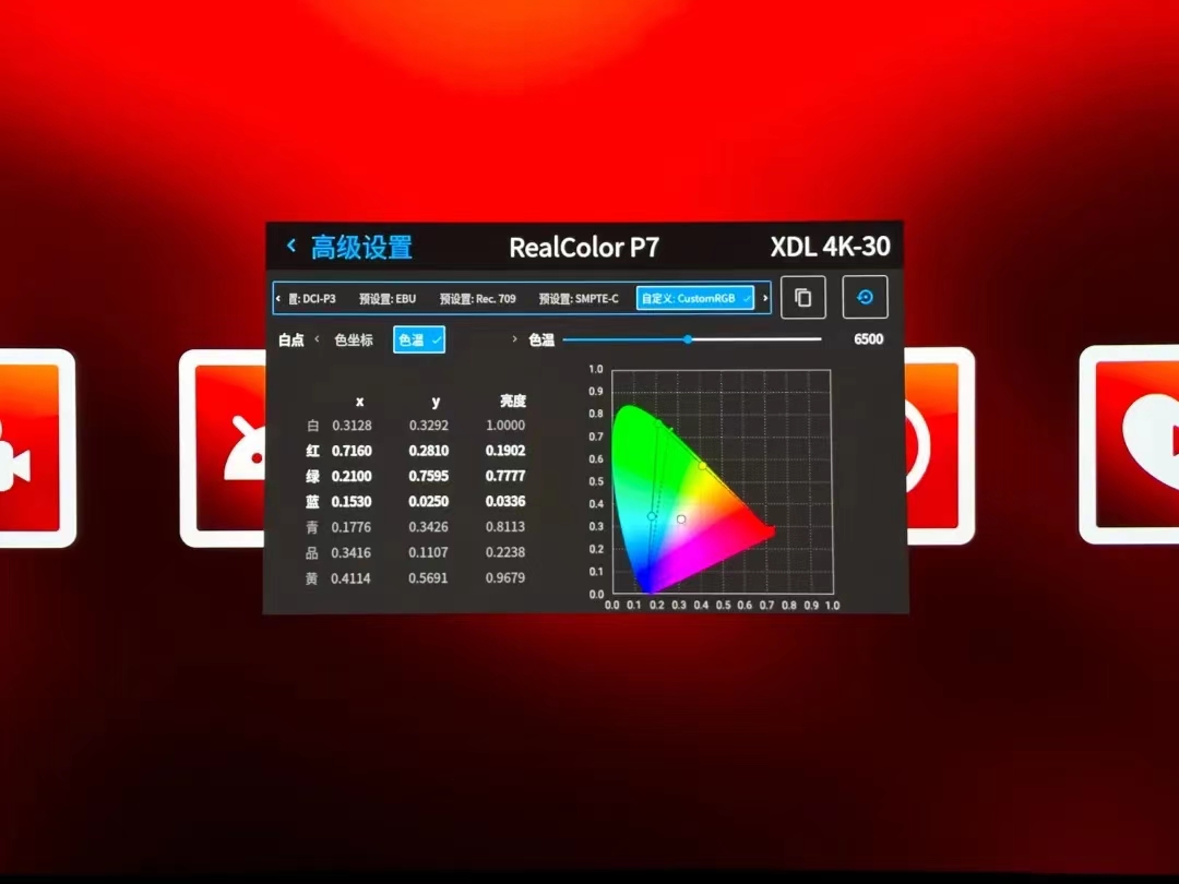 这台4K30预设了多个图像色彩模式,例如DCI-P3、EBU、Rec.709以及SMPTE-C,最后我们通过自定义色坐标来调教出合适的色温状态。