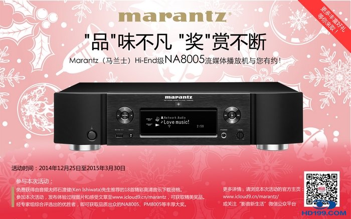 上海电音马兰士电子有限公司联手“影音新生活”全媒体平台及各大经销商(线下体验门店)于2014年12月25日至2015年3月30日期间,在全国范围内举行“Marantz(马兰士)Hi-End级NA8005流媒体播放机 、HD-DAC1解码耳放一体机与您有约!”有奖线下体验与征文活动。