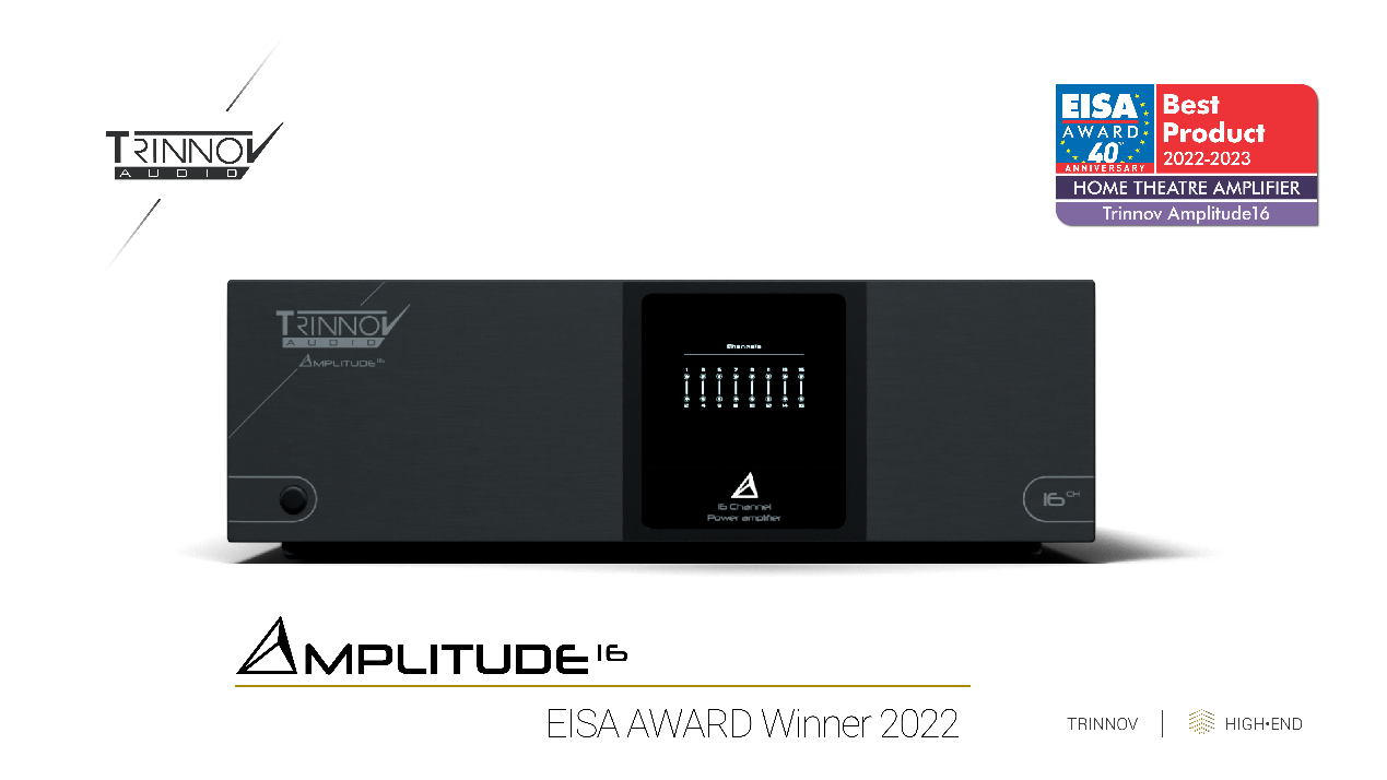 2022年8月15日,EISA(Expert Imaging and Sound Association/欧洲影像与音乐协会)公布一年一度的EISA大奖。其中,Trinnov新款16声道后级放大器Amplitude16,获得“家庭影院放大器/EISA HOME THEATRE AMPLIFIER 2022~2023”年度大奖。