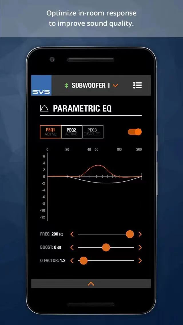 3 段参数均衡控制器可精确调节频率斜率和 Q 因子,精确到单赫兹级别,并有四种不同的斜率,因此用户可以通过消除峰值、空档和其他房间问题来提高性能。