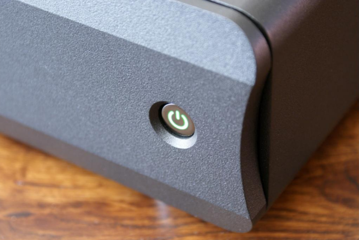 转移到功放器的正面,厚实的铝板经过精美加工,略微向内弯曲的边缘为其带来了流线型的外观。Ultrafide标志被倒角处理并位于顶部中央,唯一的其他特征就是稍微凹陷的电源按钮。