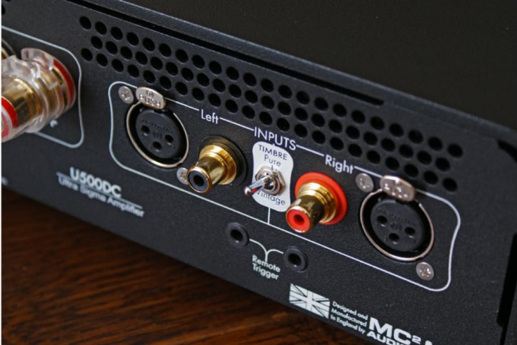 信号输入接口既包括XLR接口,也包括RCA接口。在连接口之间有一个小型切换开关,标有“音色”(Timbre)。可供选择的模式有“纯净”(PURE)和“复古”(VINTAGE)。关于如何使用这个开关,我会在后面的评论中详细介绍。 在输入接口下方还有两个触发输入连接器,用于连接其他Ultrafide设备,比如即将发布的U4PRE匹配预级放大器。