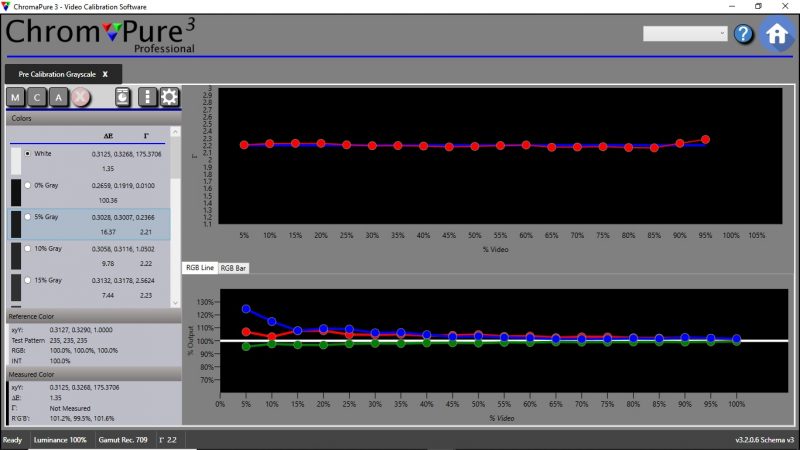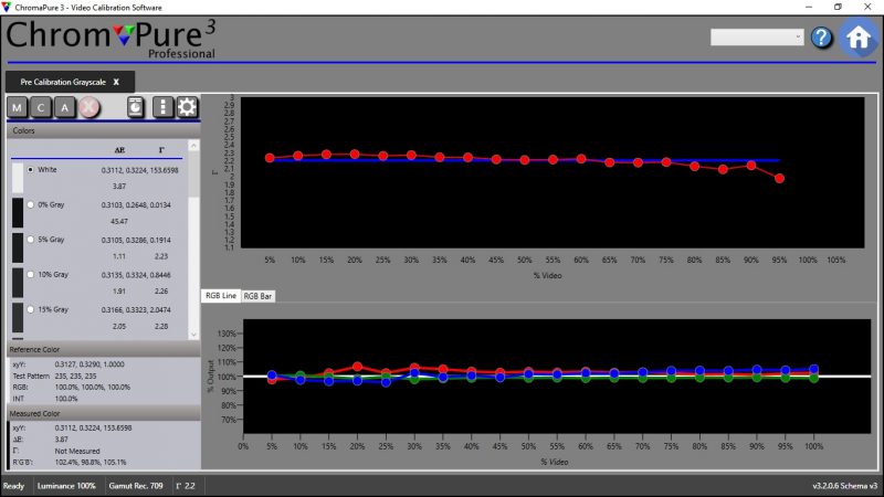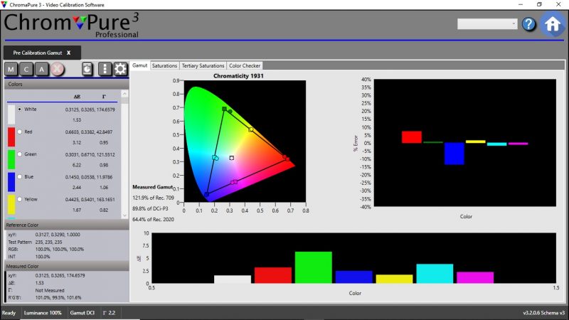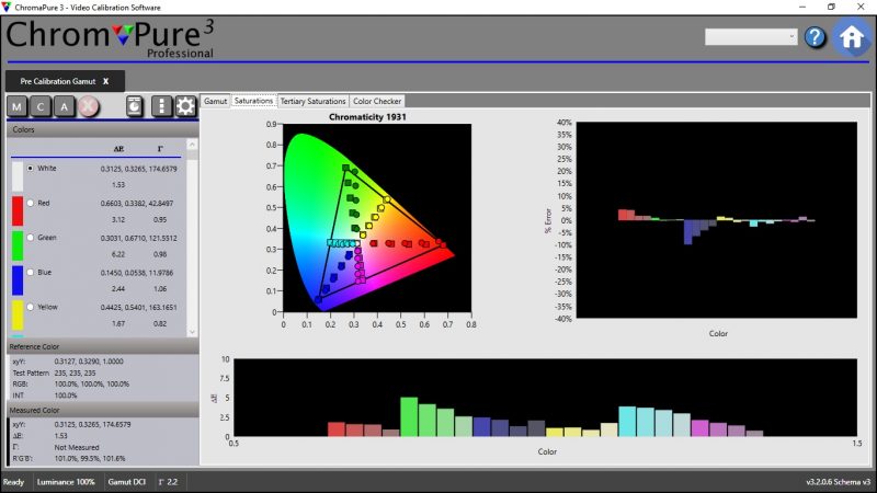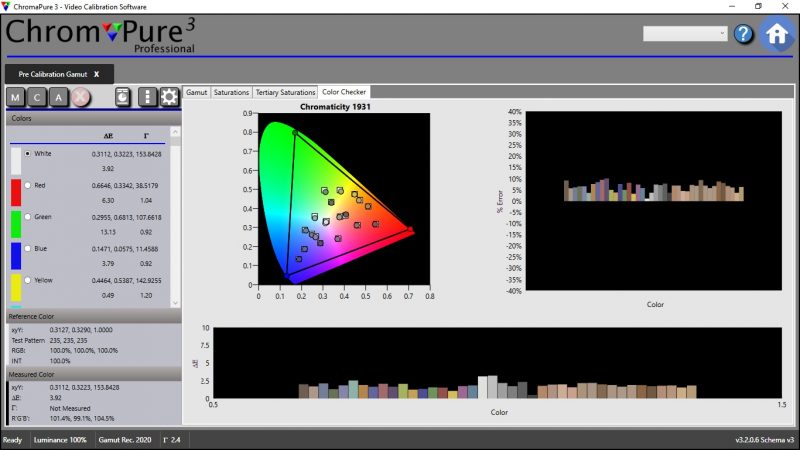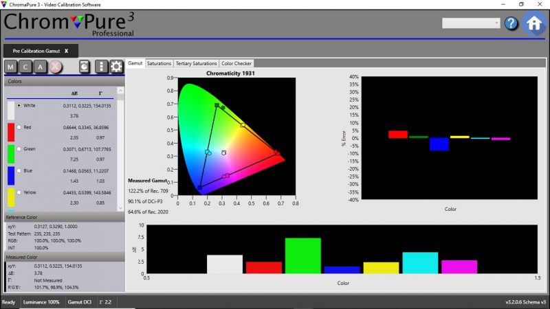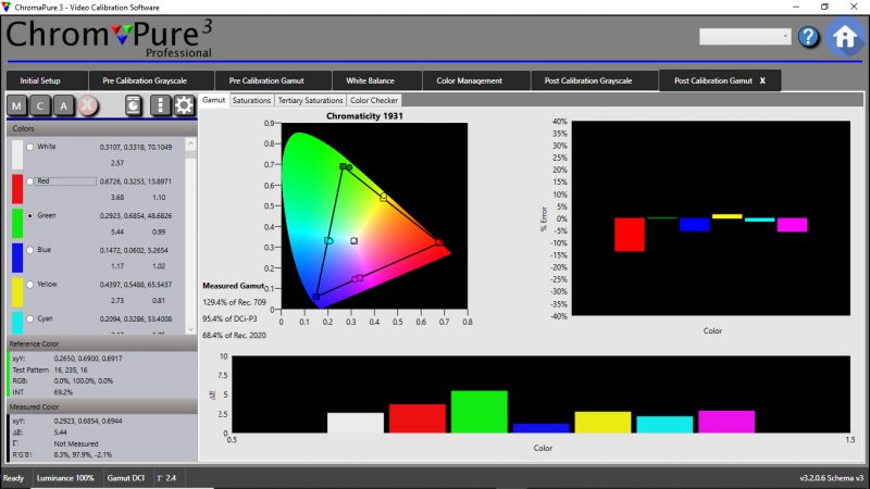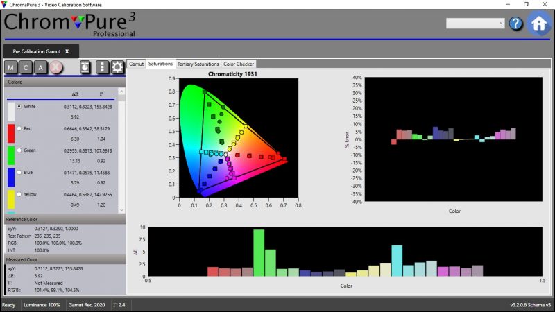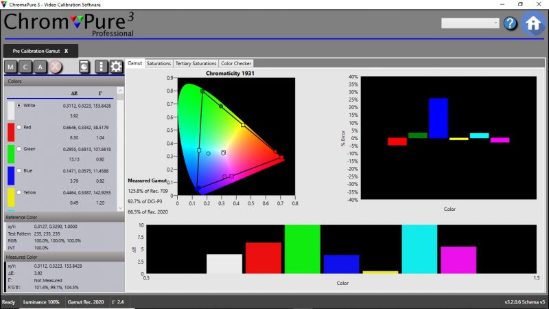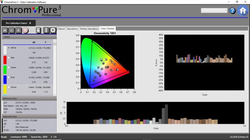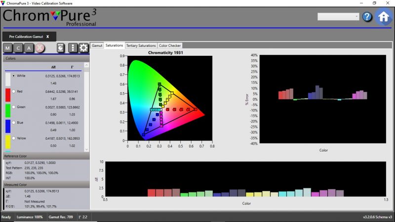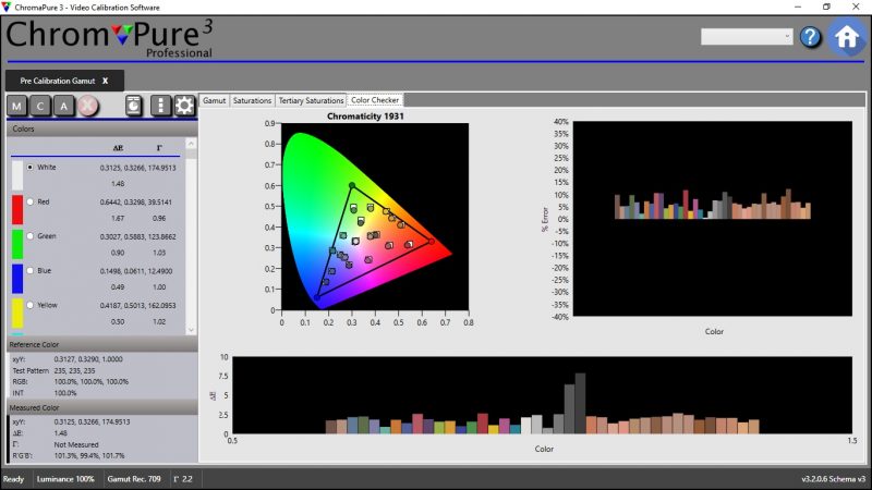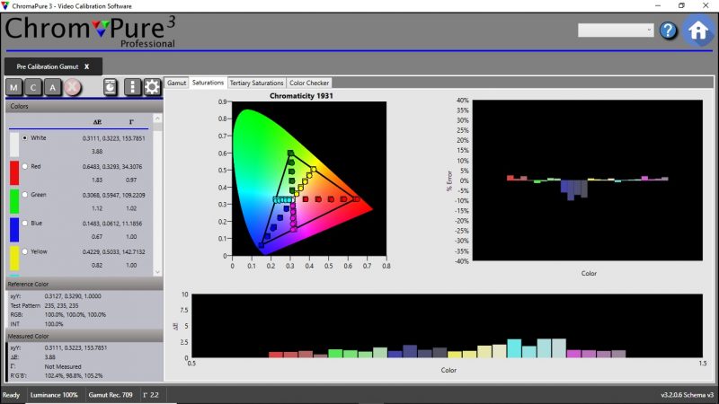 不出所料,因为这是惯例,VPL-XW6100 以一种出色的方式展示了 BT.709 色彩空间。无需任何调整,中间饱和度就处于正确的位置。色彩检查器显示出很小的误差,大多数 dE 值低于 2(4 是视觉阈值),这非常出色。