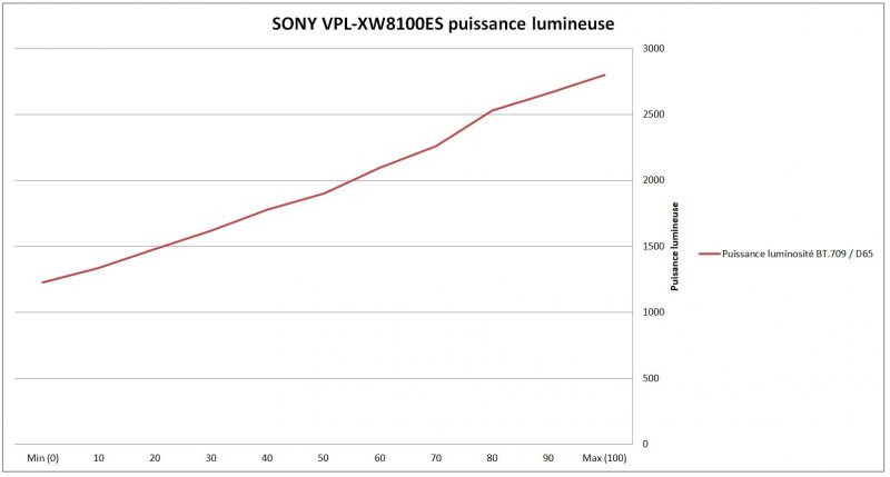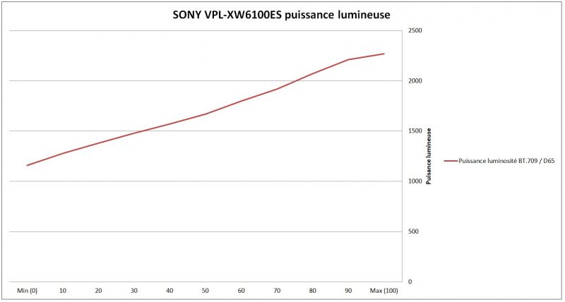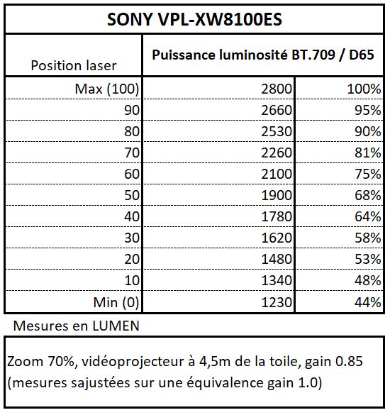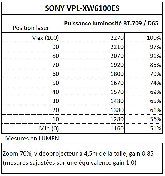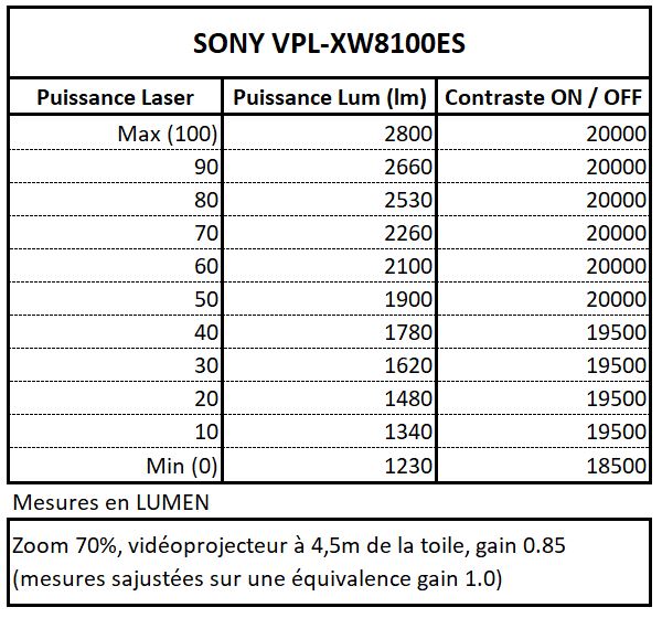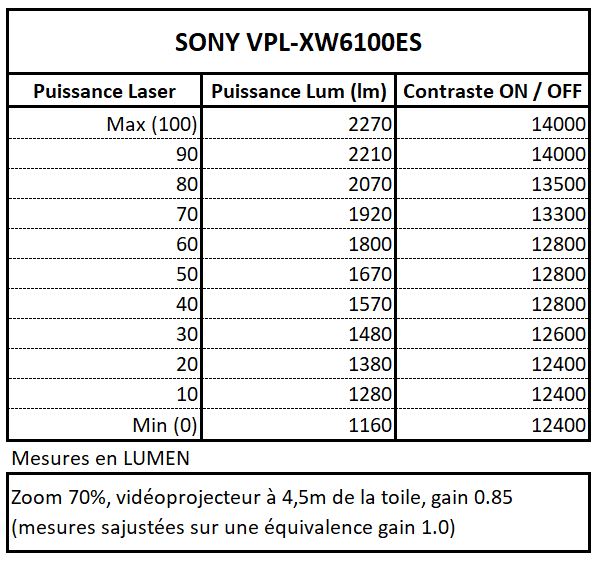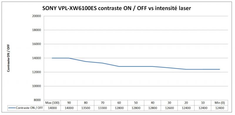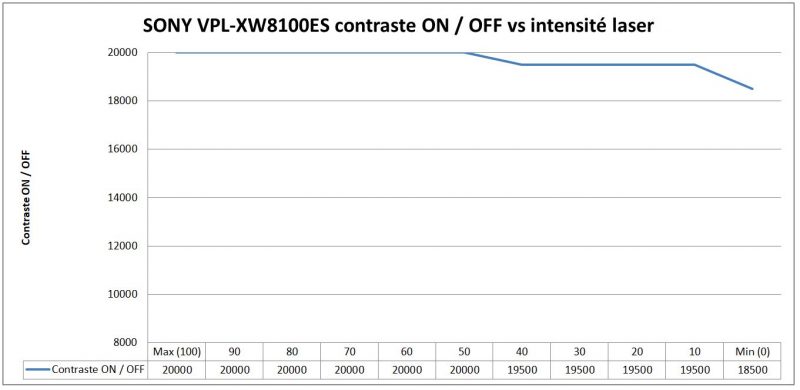 请记住我们对 VPL-XW7000 的测量结果。当时我们发现,激光功率不应低于 30,否则顺序对比度会显著下降,从标称值 14000:1 下降到 9200:1(激光功率最低时),损失了 34%。
