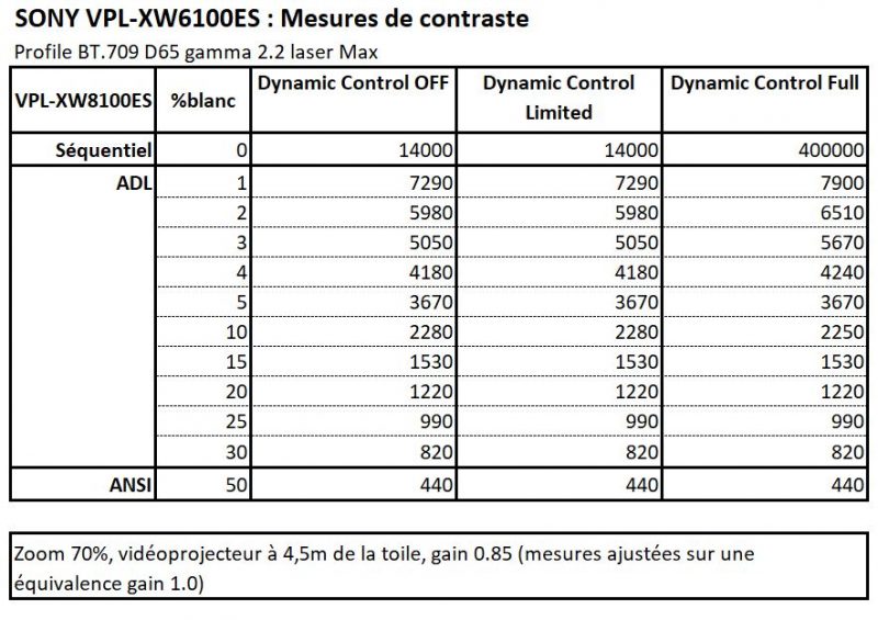 正如我们在 VPL-XW7000 的测试中测量和解释的那样,激光调光主要在合成图像上工作。在简单的测试图案上,其作用在非全屏模式下很难测量,尤其是在非常低的 ADL 模式下。主要是在 IRE0 测试图案上。这是合理的,因为全屏模式会完全关闭激光,从而显示出房间允许的最深黑位。