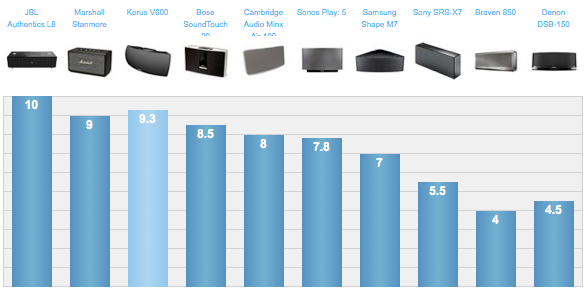 今年11月份,10TopTenREVIEWS网站评选了十大无线音箱,Korus 酷斯拉V600以9.4分名列第一。