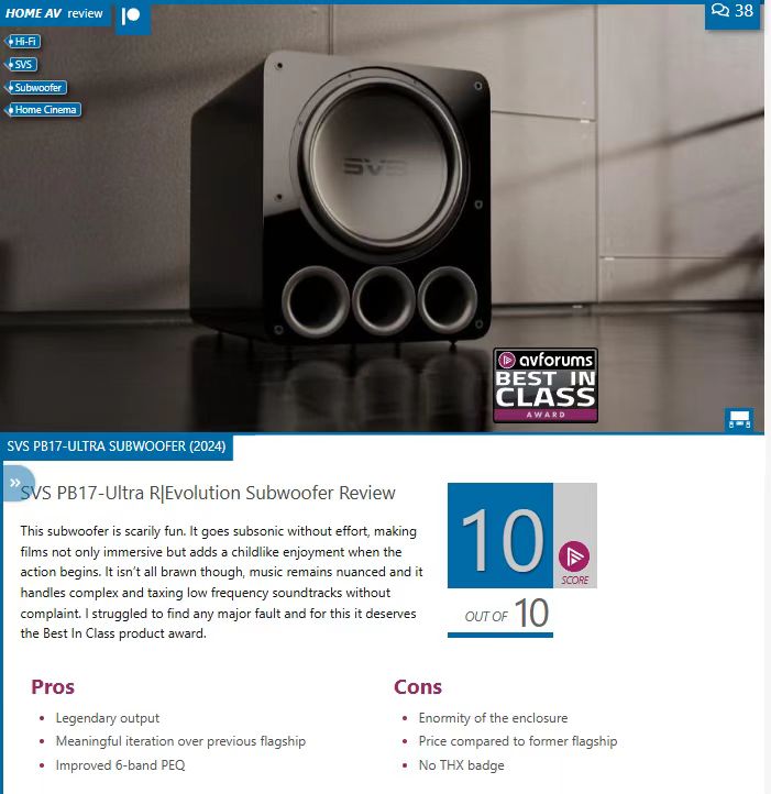 近期,美国 SVS 的旗舰低音炮 PB17-Ultra R|Evolution,成功斩获 AVforums 颁发的 “BEST IN CLASS(同级最佳)” 奖项!