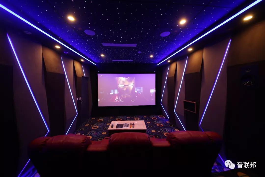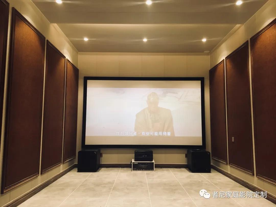 影音室整体采用了定制安装的解决方案,幕布墙采用了THX音障墙设计,主箱则位于133寸幕布的空间后。
