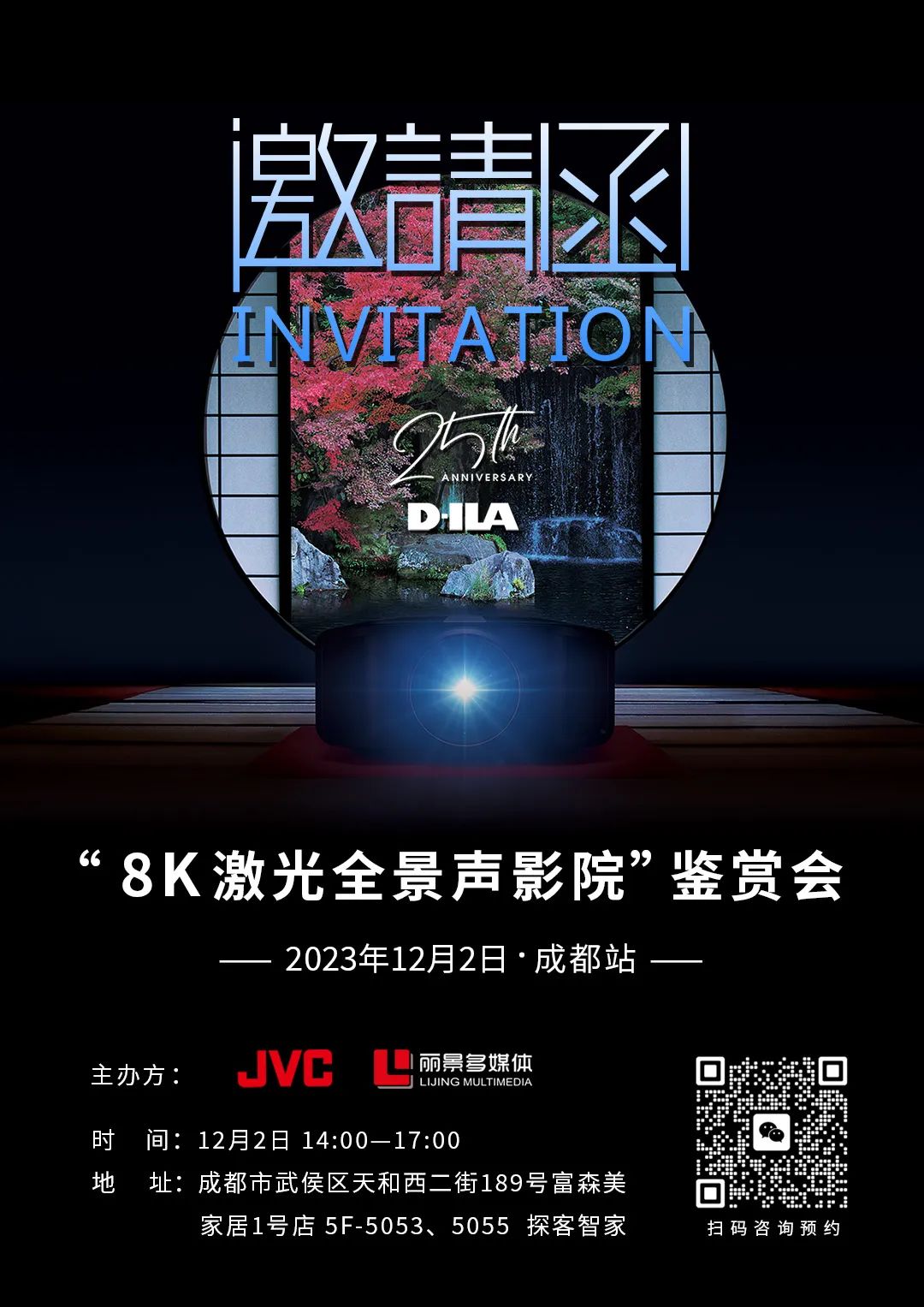 JVC享誉世界的“D-ILA”电影投影机诞生25周年之际,为方便客户体验JVC高端电影投影机产品,JVC与全国总代理上海丽景共同推出JVC “8K激光全景声影院”全国巡展计划,我们将与各地核心经销商伙伴合作,举办“JVC 8K激光全景声影院”鉴赏活动,
